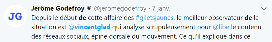 Un commentateur en particulier a émergé comme l’un des « décrypteurs » les plus intéressants des GJ : le journaliste Vincent Glad, « spécialiste de la culture Internet » comme le présente L’Express. Depuis le début du mouvement, il écrit quotidiennement sur son Twitter ses réflexions, qui sortent souvent du lot.