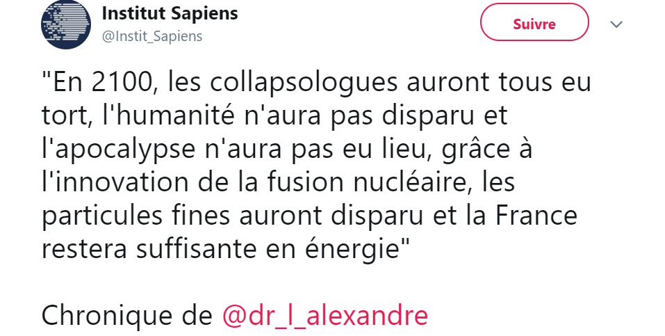 Servigne et Stevens l’expriment ainsi au début de leur ouvrage : « Dans l’espace intellectuel, la question de l’effondrement n’est pas abordée sérieusement. La fameux bug de l’an 2000, puis « l’évènement maya » du 21 décembre 2012 ont évincé la possibilité de toute argumentation sérieuse et factuelle. Evoquer un effondrement en public équivaut à annoncer l’apocalypse, donc à se voir renvoyer à la case bien délimitée des « croyants » et des « irrationnels » qui ont « existé de toute temps ». Point barre, sujet suivant. Ce processus de bannissement automatique – qui pour le coup apparaît vraiment irrationnel – a laissé le débat public dans un tel état de délabrement intellectuel qu’il n’est plus possible de s’exprimer que par des postures caricaturales qui frisent souvent le ridicule ».