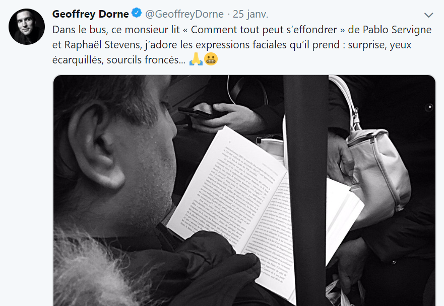 Le terme d’effondrement n’est aujourd’hui plus un signal faible : il a fait son entrée dans le débat public en 2018. L’Obs y a consacré un dossier spécial de 8 pages à l’automne dernier, soulignant le rôle joué par le livre de Servigne et Stevens : « En France, la notion de collapsologie doit véritablement son décollage à « Comment tout peut s’effondrer », porté par le bouche-à-oreille ». Le magazine Socialter en a fait un hors-série dédié. La revue Usbek & Rica en a fait un numéro spécial. Un podcast est né pour l’explorer, Présages. Le livre est désormais cité par les grandes figures françaises du sujet climatique, de Jean-Marc Jancovici à Aurélien Barrau.