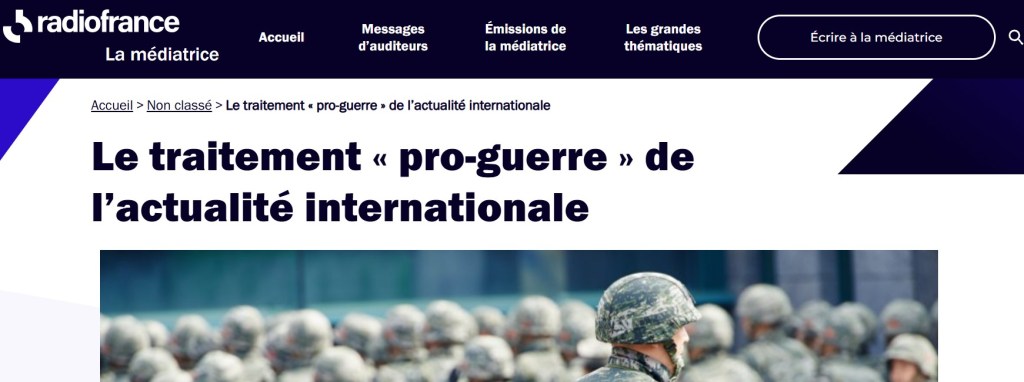 C’est au point que la médiatrice de Radio France y a consacré l’un de ses éditoriaux il y a quelques semaines, consultable ici. On y lit, notamment, que pour certains auditeurs, « la couverture éditoriale donne le sentiment d’habituer progressivement l’opinion à l’idée de guerre », de participer à une « communication de guerre » autour d’une seule et même ligne, et de créer un « déséquilibre dans le traitement de l’information », celle-ci étant accusée d’être « orientée vers le réarmement et les postures militaires au détriment d’approches diplomatiques ou orientées vers la résolution des conflits ».