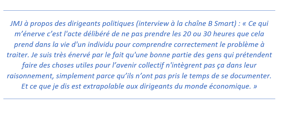 Malgré ce constat, les démonstrations de JMJ commencent, comme vu dans la partie 1, à faire leur chemin auprès de ceux qui hier ne voulaient pas y croire. En cela l’apport de JMJ est déterminant : en ayant l’oreille d’un nombre croissant de personnalités influentes – jusqu’ici très peu sensibilisées aux questions écologiques – dans des sphères variées, il contribue à faire avancer les mentalités et à ouvrir des débats cruciaux, comme peu le font.
